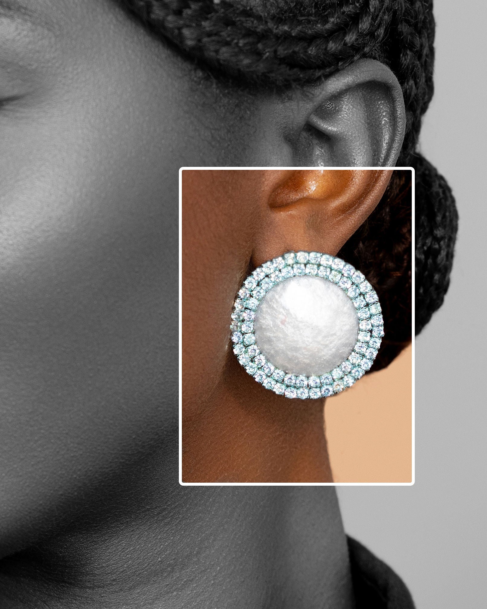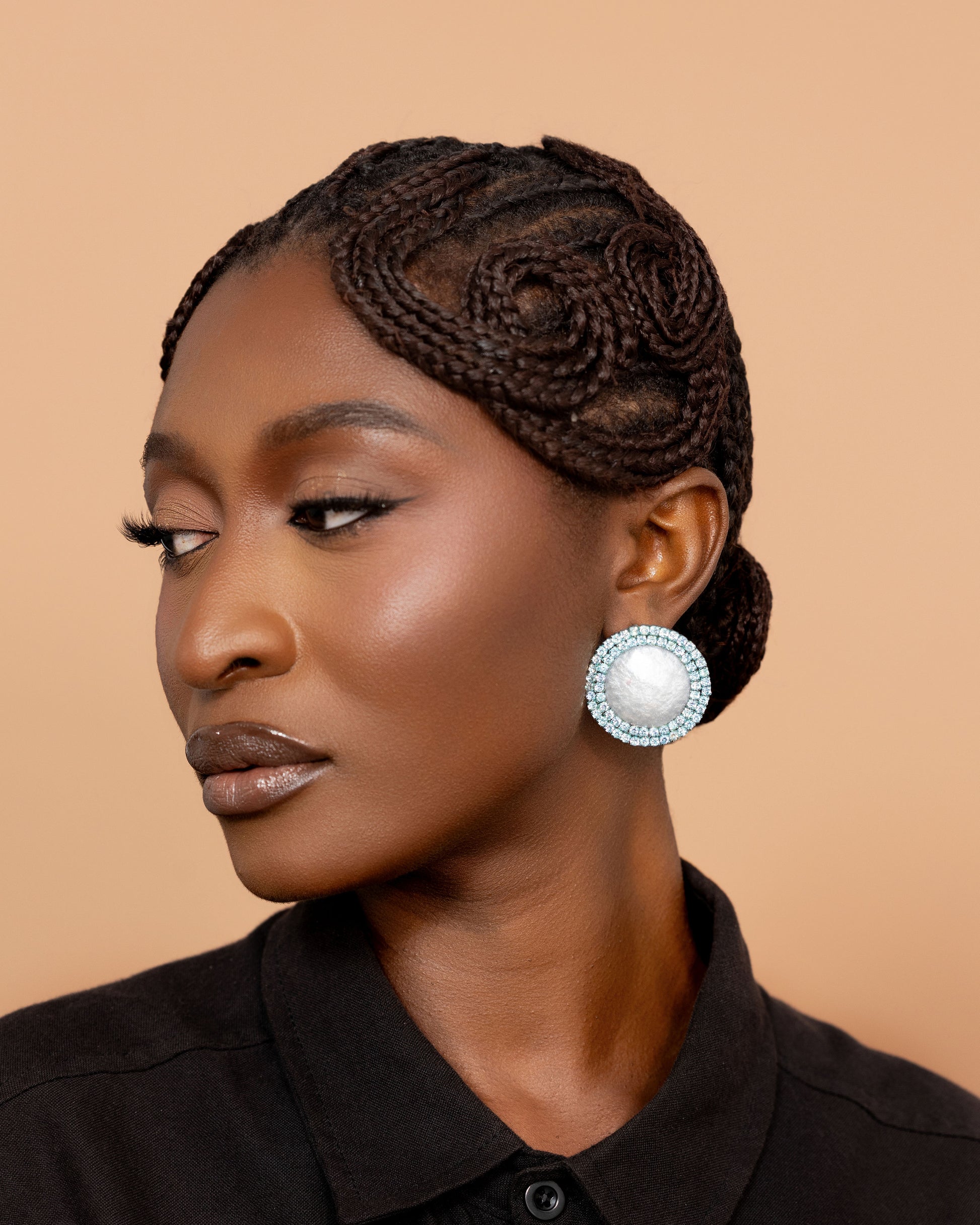 Caitlin stud earrings are made of resin centered cabochon surrounded by crystal rhinestones. Handmade in Ghana.