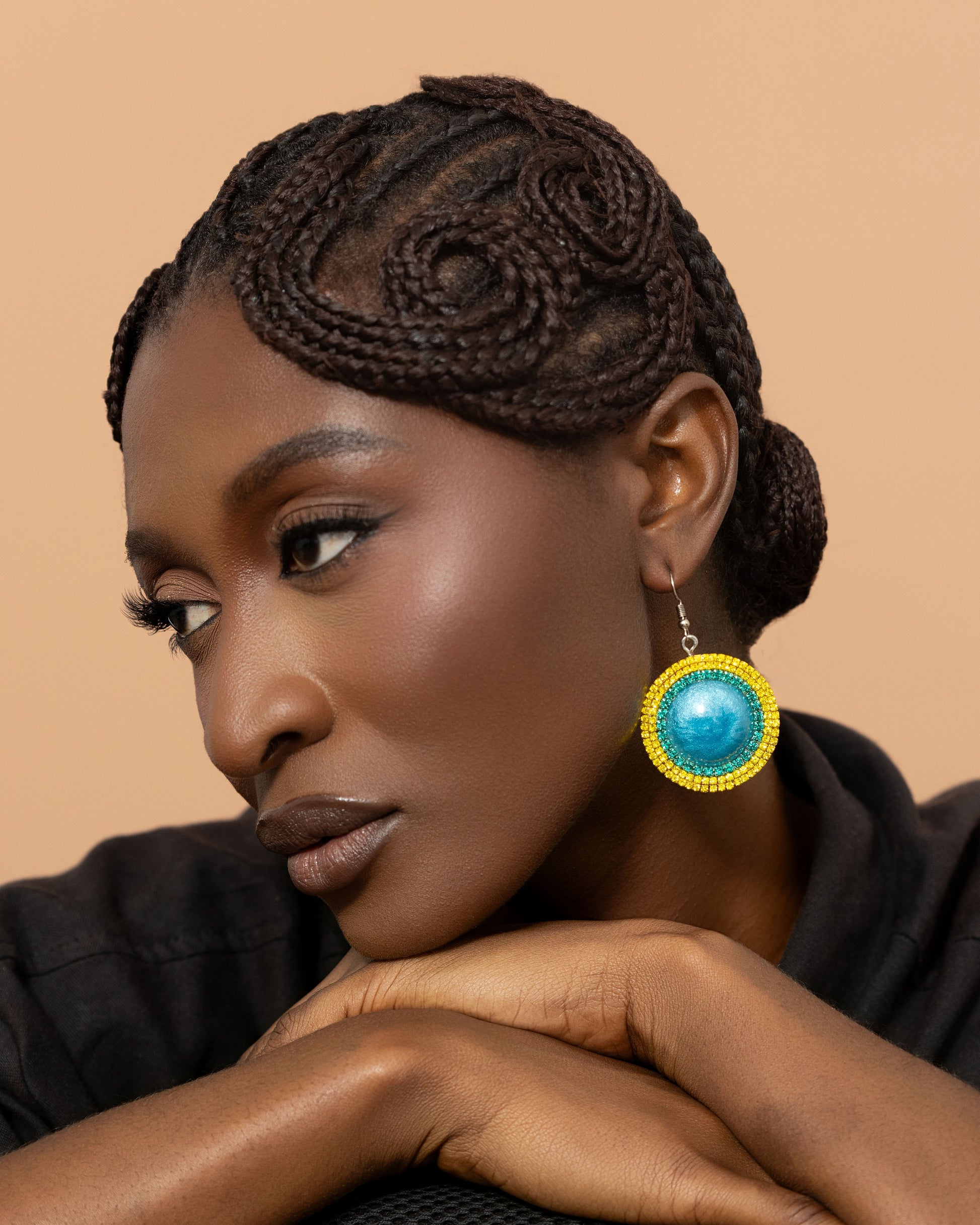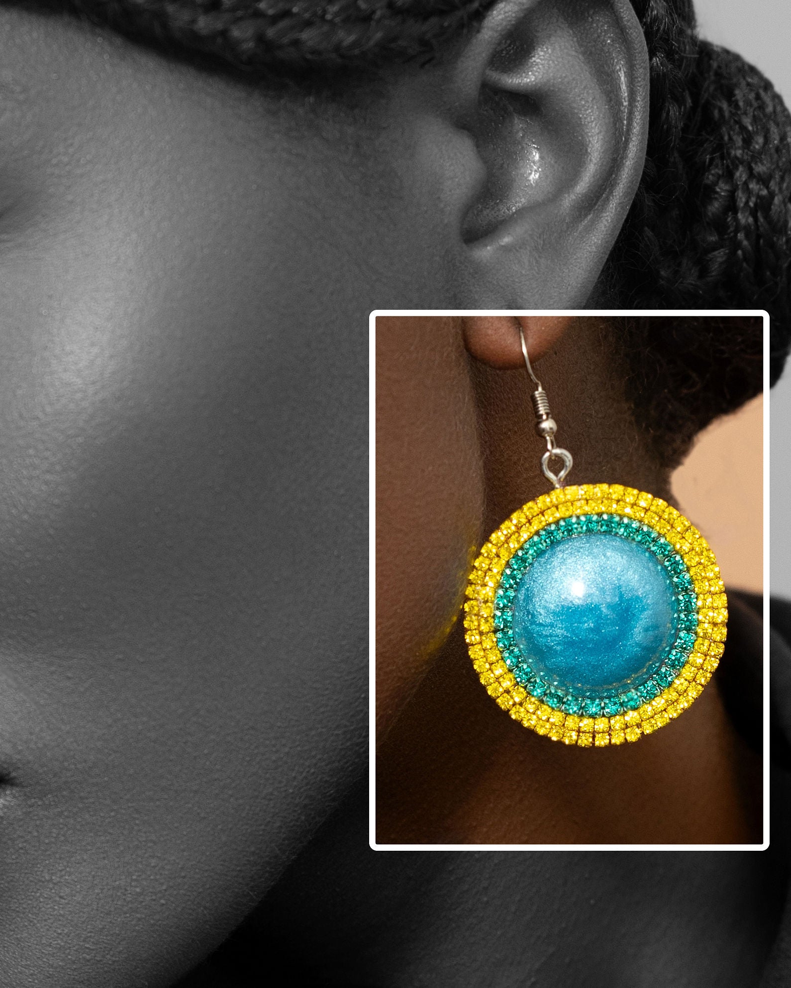 Callie hook earrings are made of resin centered cabochon surrounded by crystal rhinestones. Handmade in Ghana.