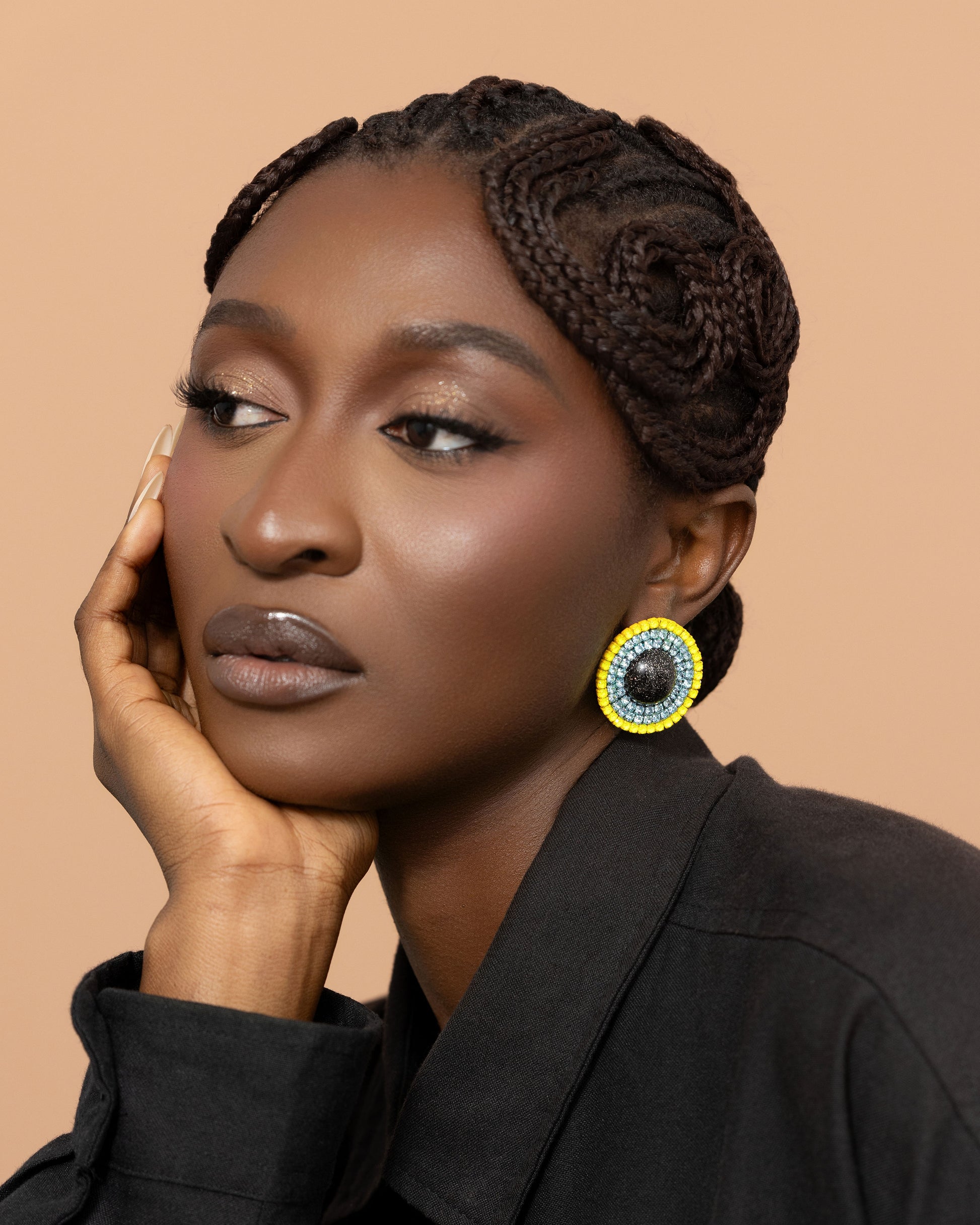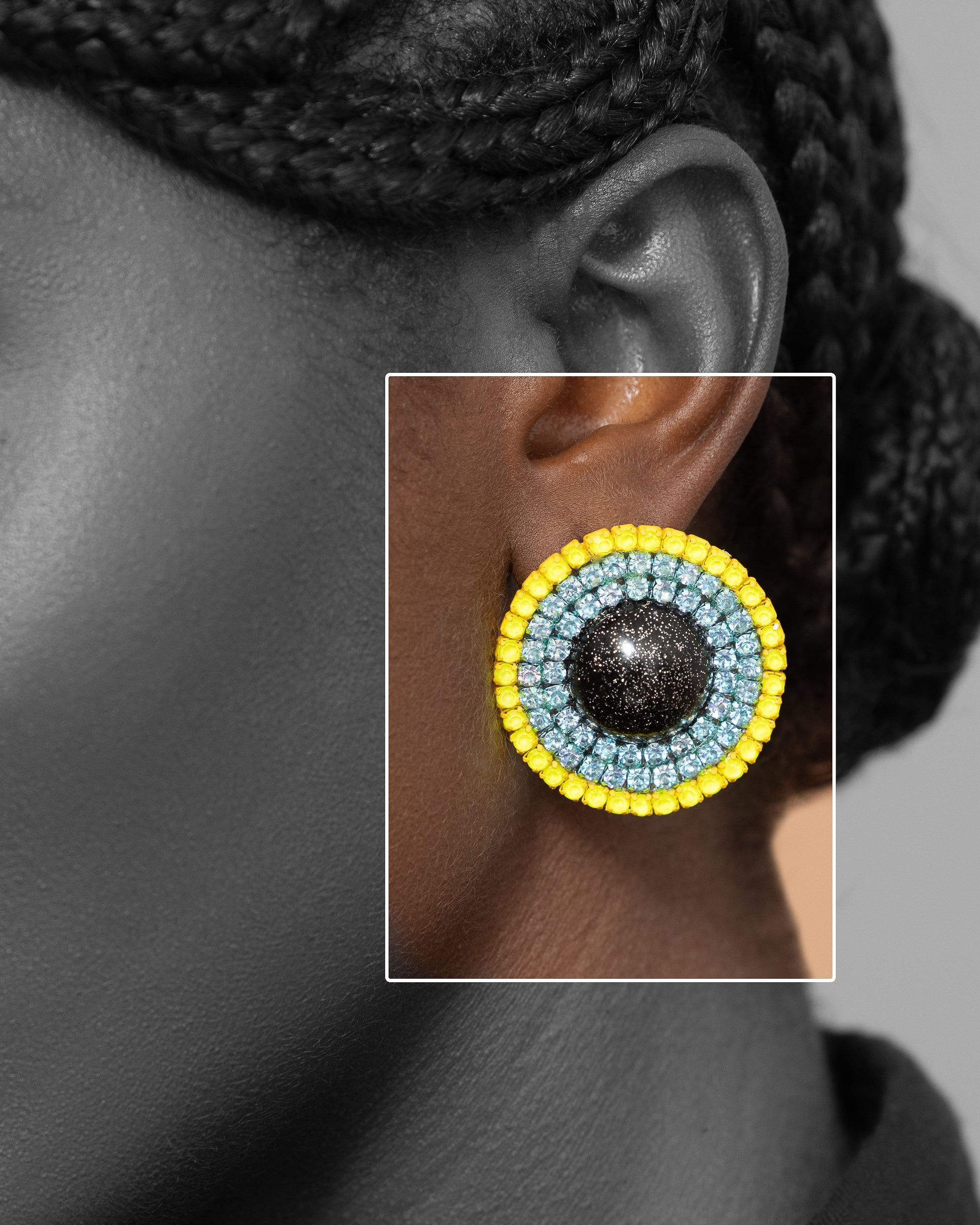 Harlow earrings are made of resin centered cabochon surrounded by crystal rhinestones. Handmade in Ghana.