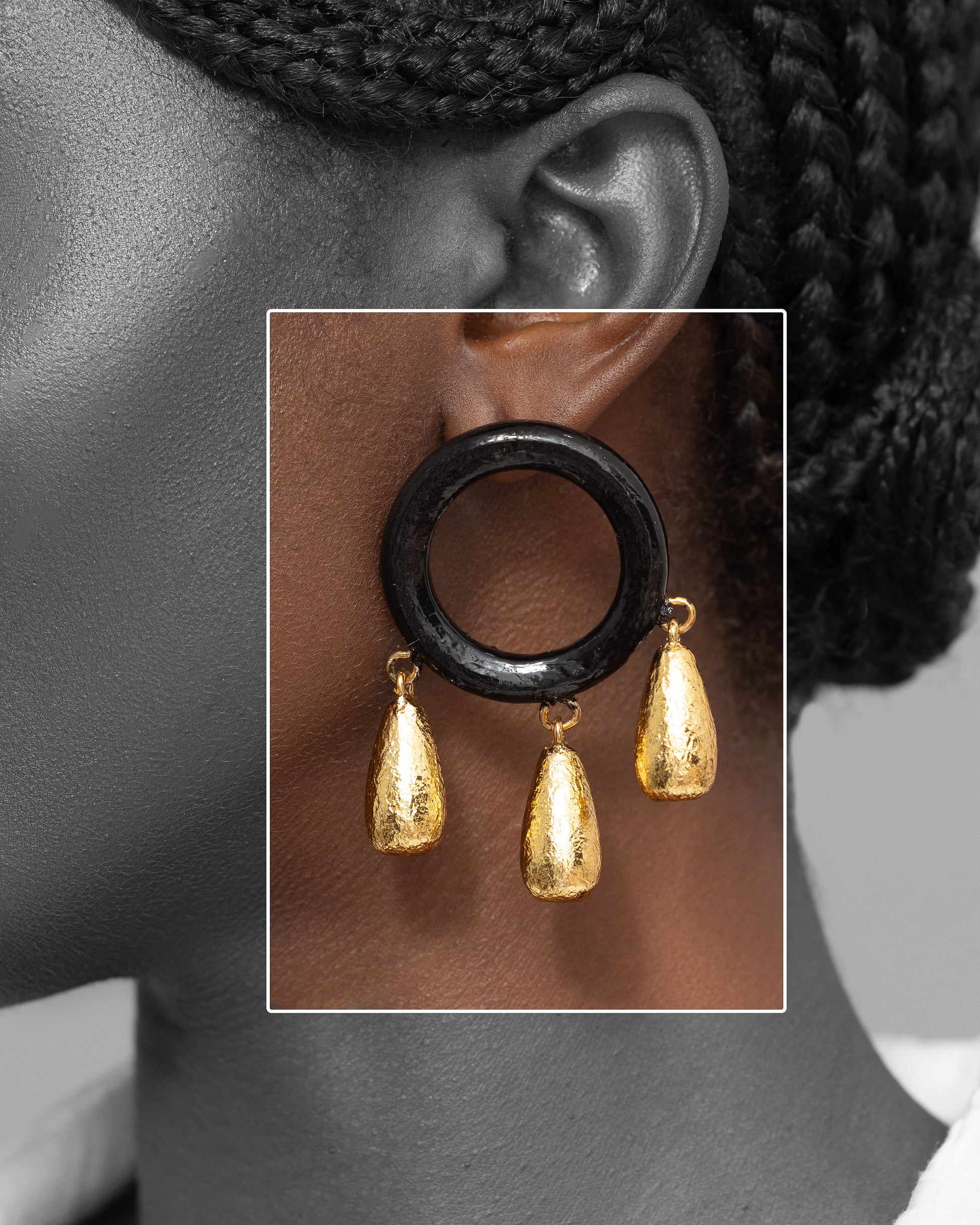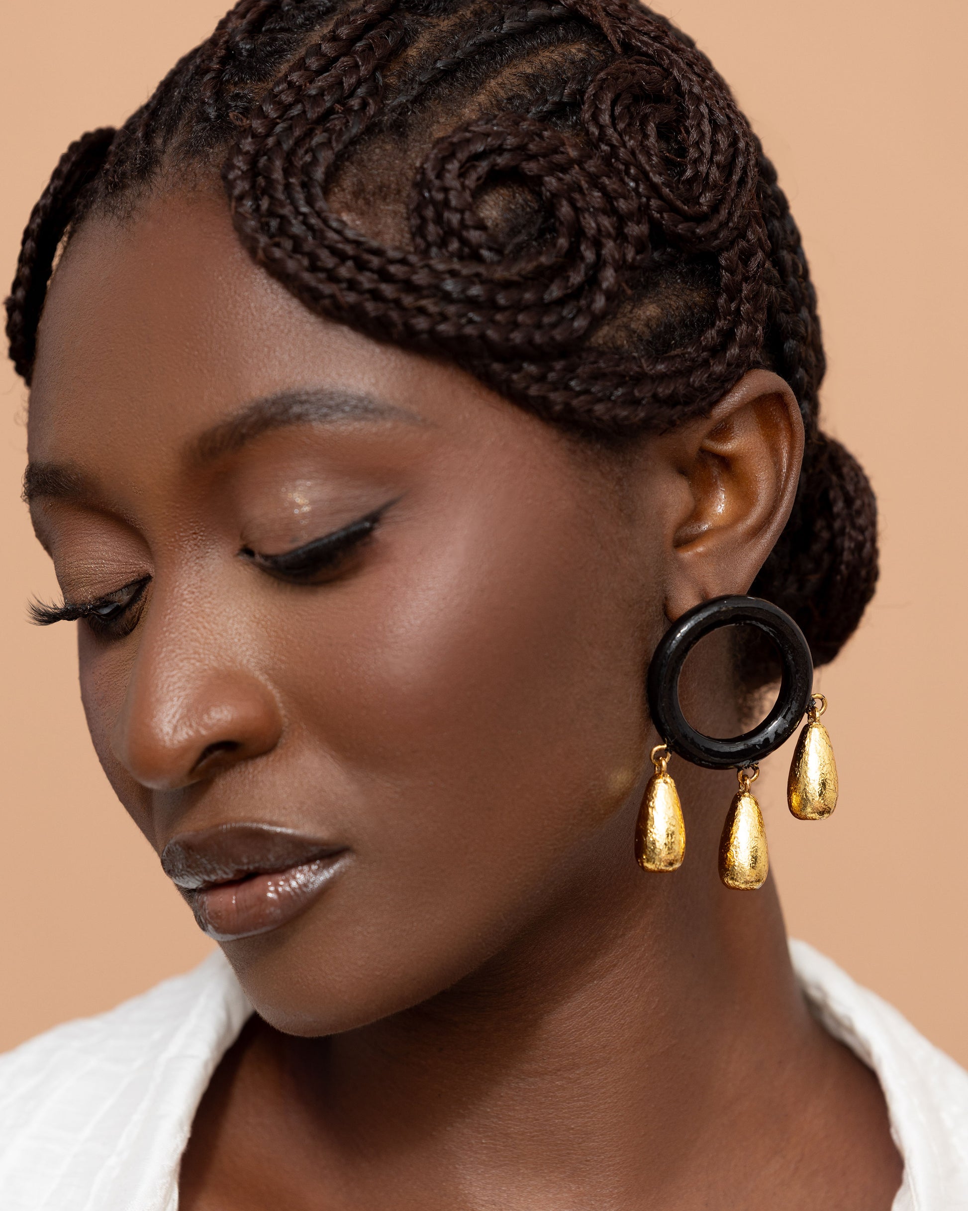 Korleki stud earrings are made of hand wood, acrylic drops and gold foil. Handmade in Ghana with love.