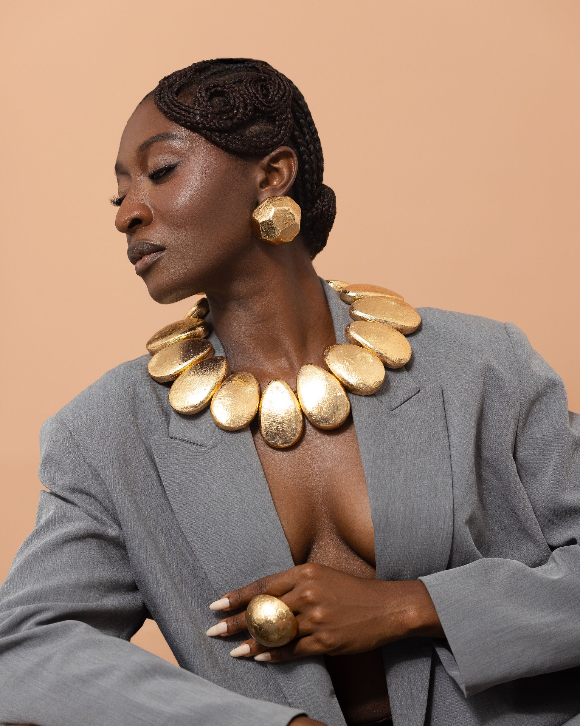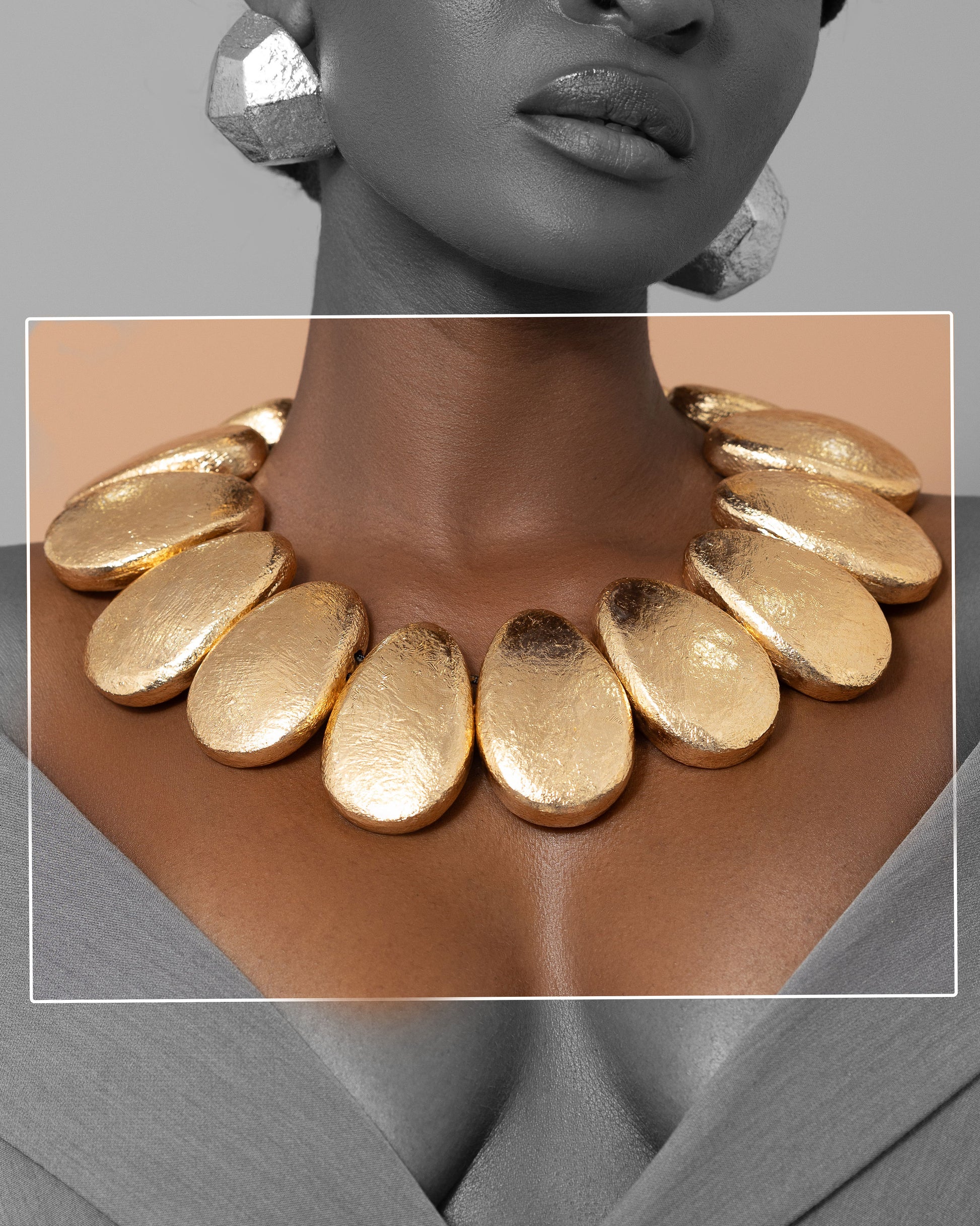 Oboshie collar is made with calabash and champagne gold foil. Collar is approximately 20 inches in length. This collar comes with a pair of earrings to match. Note that it takes a 7 working to complete this piece once order is placed.