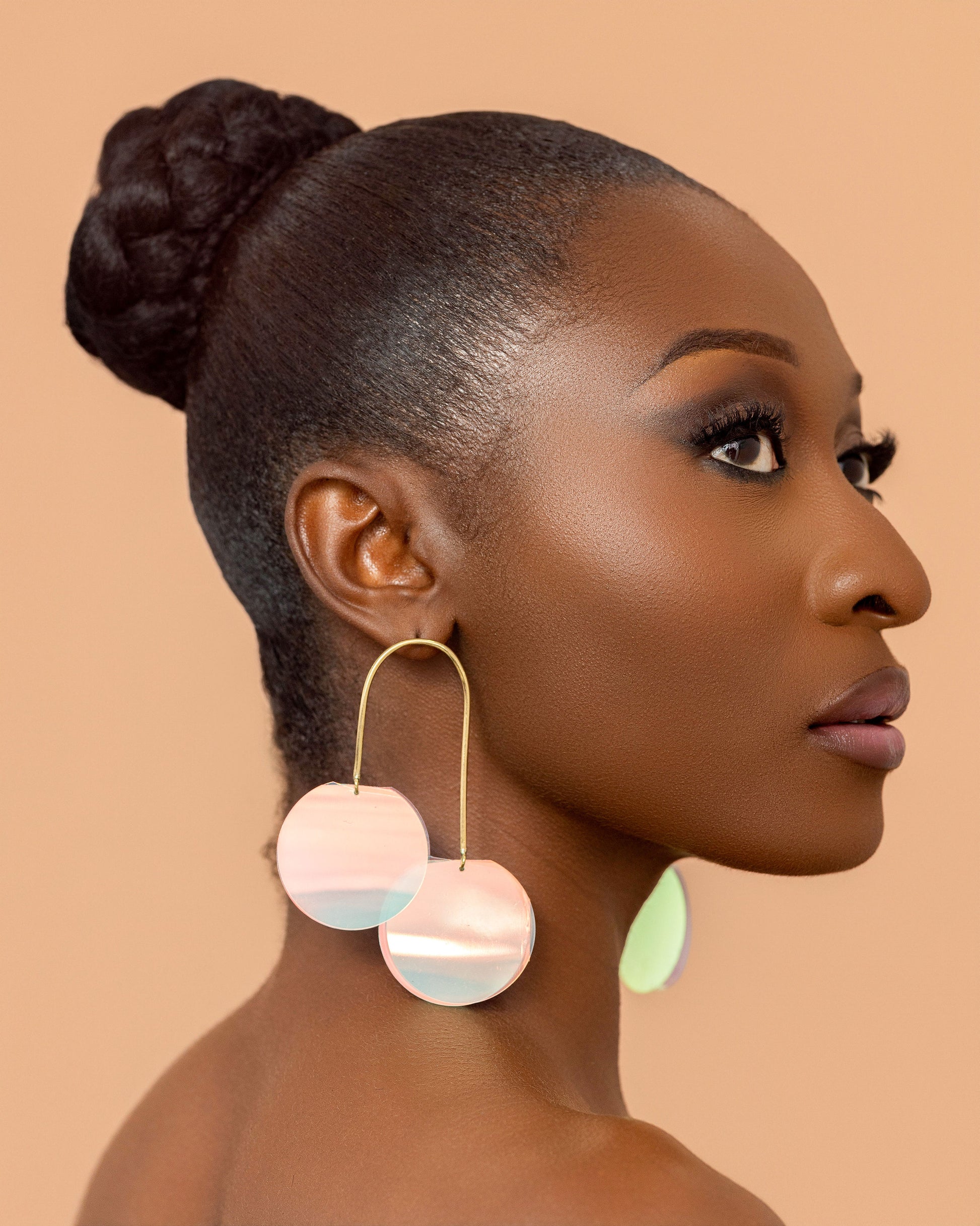 The Rachel Earrings are refined stud earrings handcrafted from brass and finished with iridescent sequins that softly reflect light. Lightweight and elegant, they are designed for effortless, everyday sophistication.