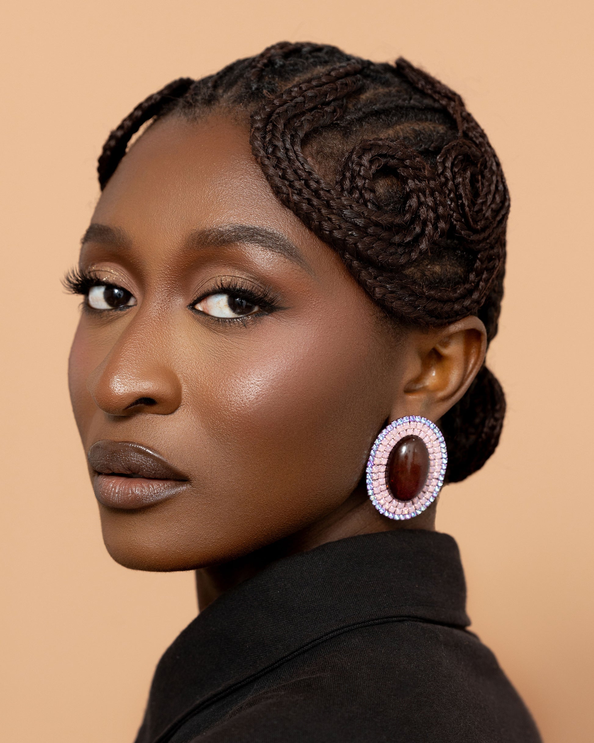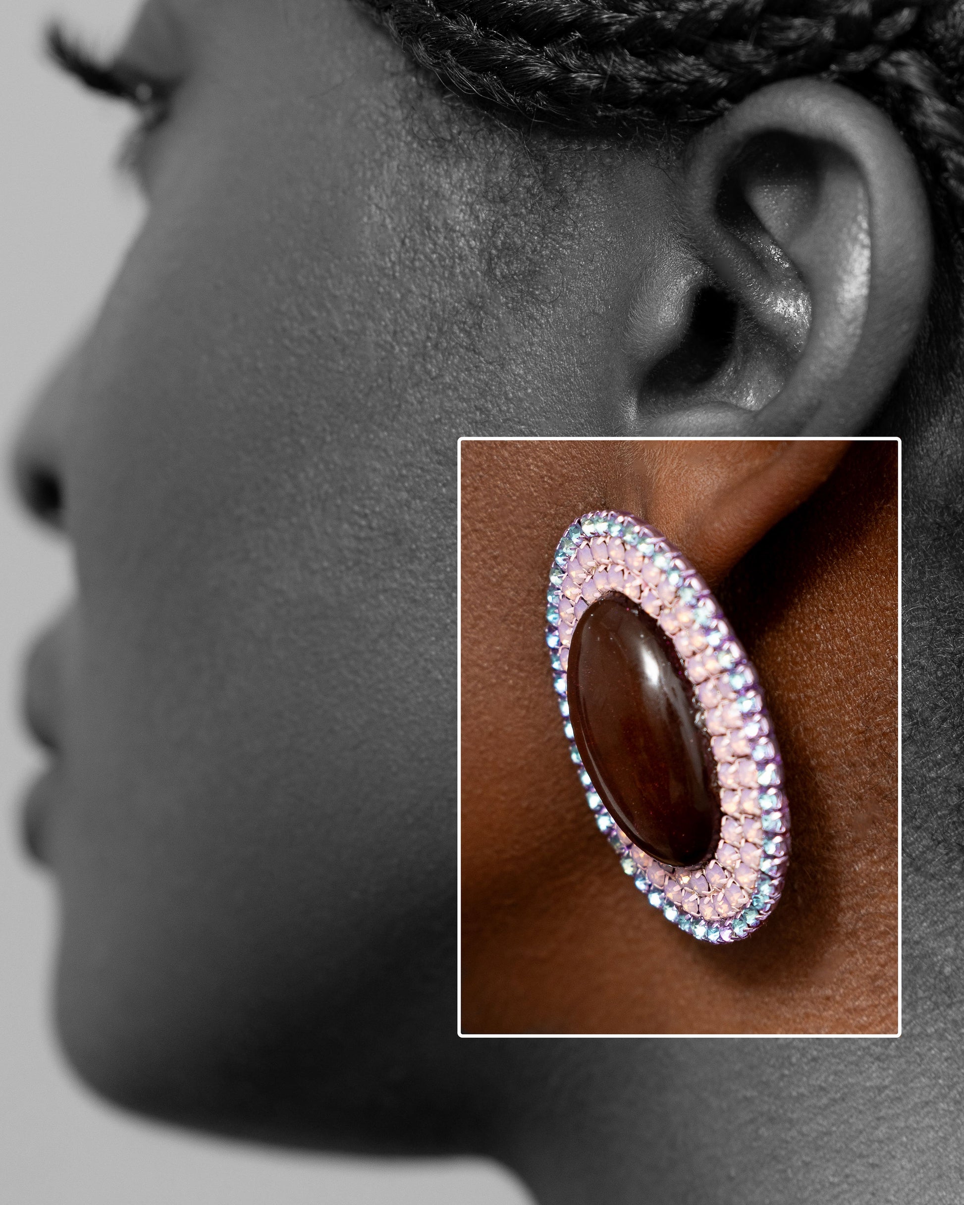 Varya stud earrings are made of resin centered cabochon surrounded by crystal rhinestones. Handmade in Ghana.